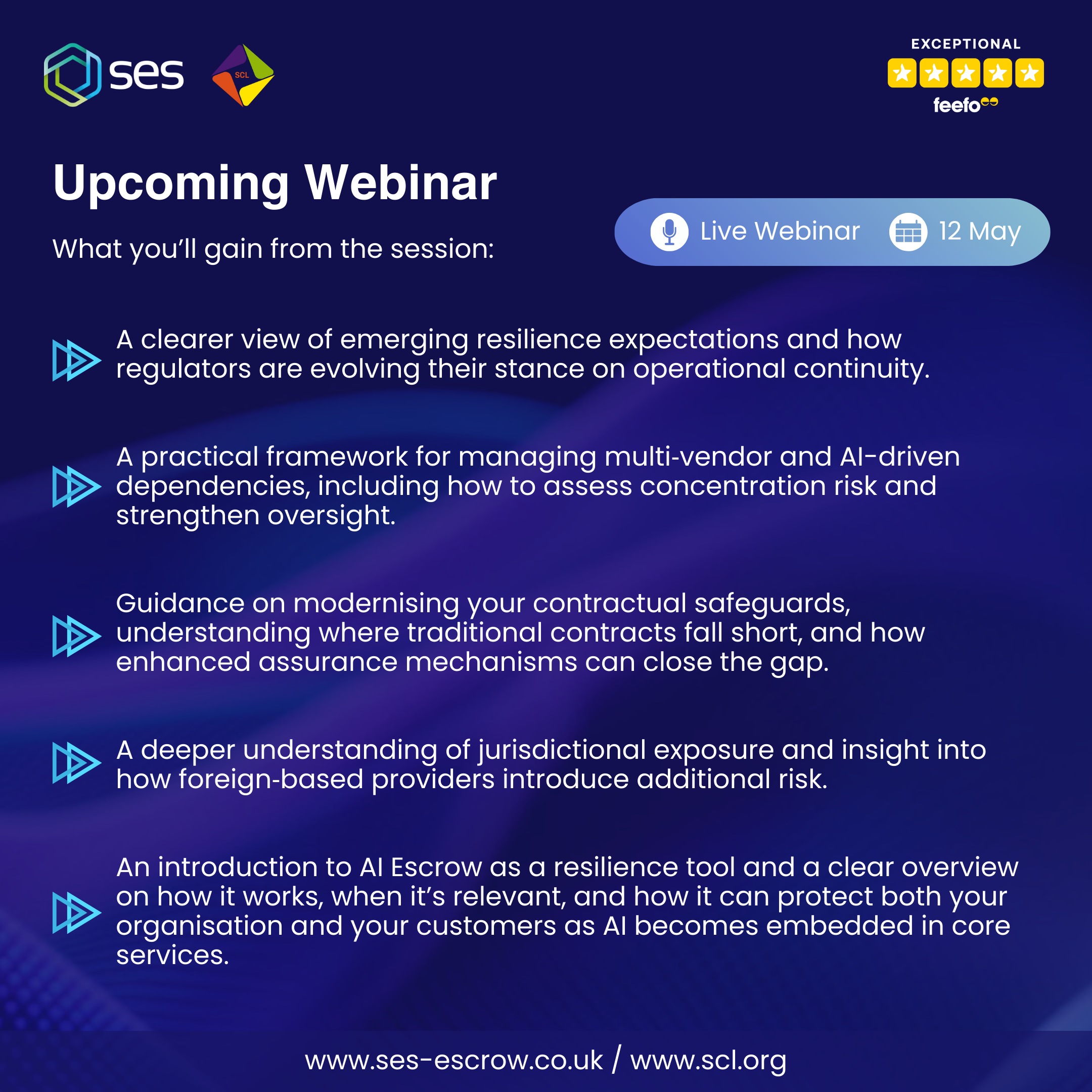 Led by Mark Ryan, SES Head of Escrow & Continuity, and Tom Sweet, SES Head of Technology, the webinar will examine the shifting pressures shaping tech‑driven services and highlight what legal professionals need to consider to stay ahead.